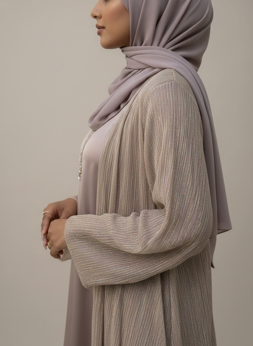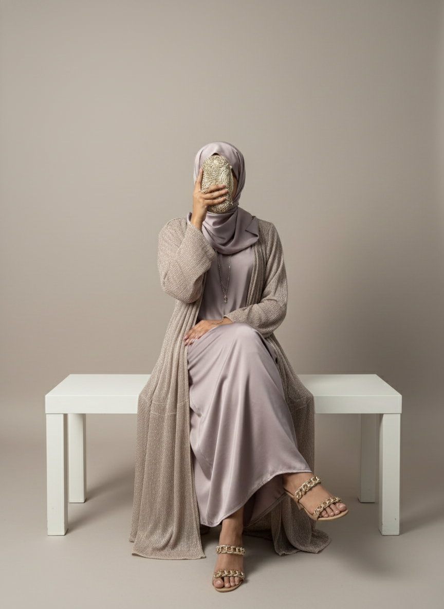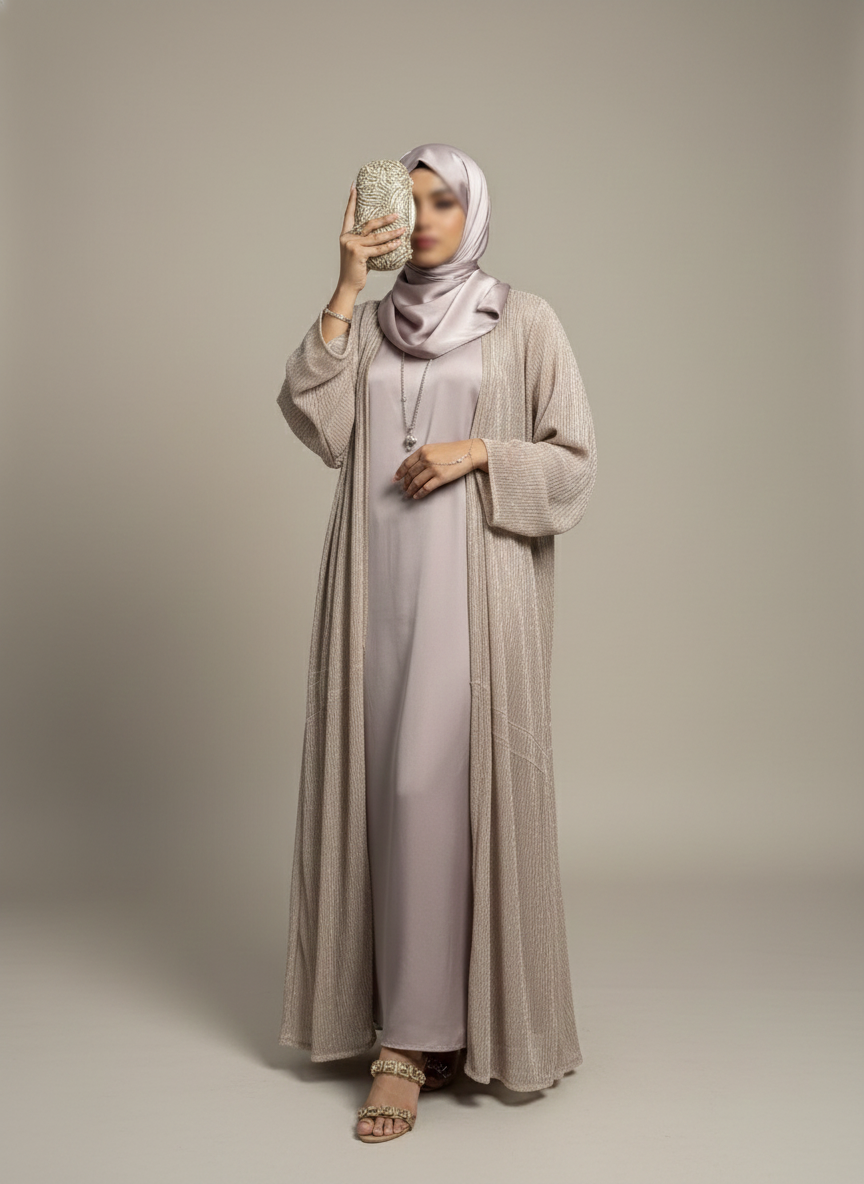 The premium moonlight satin festive gown in lilac lights is paired with a Korean lilac silk inner and same silk hijab.