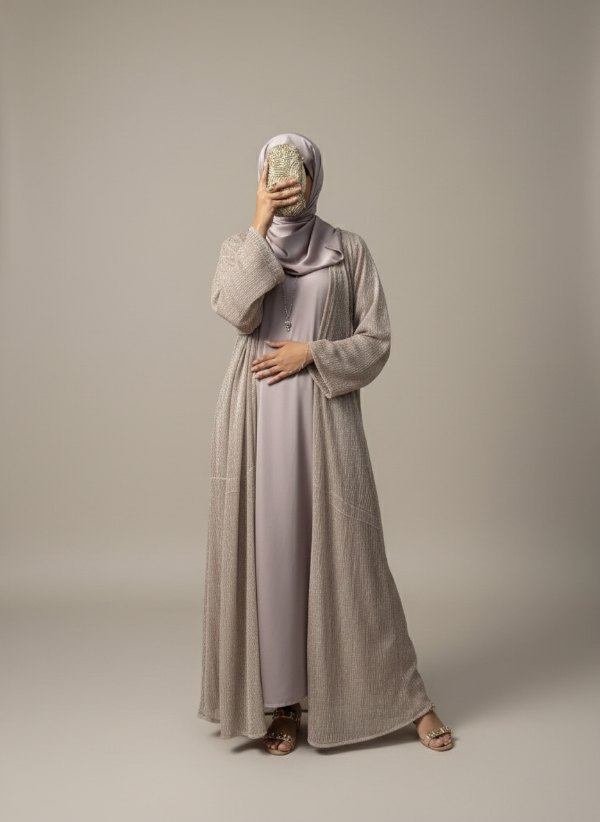 It is a 3-pc luxury black abaya including a separate gown and lilac silk hijab.