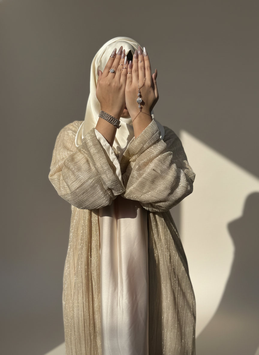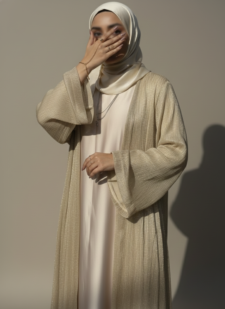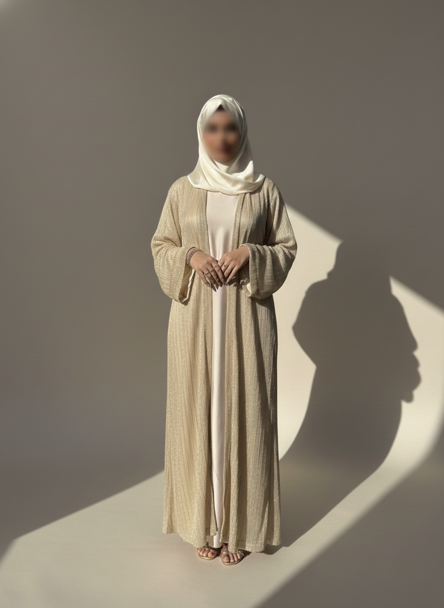 It is a 3-pc luxury ivory abaya including a separate gown and ivory silk hijab.