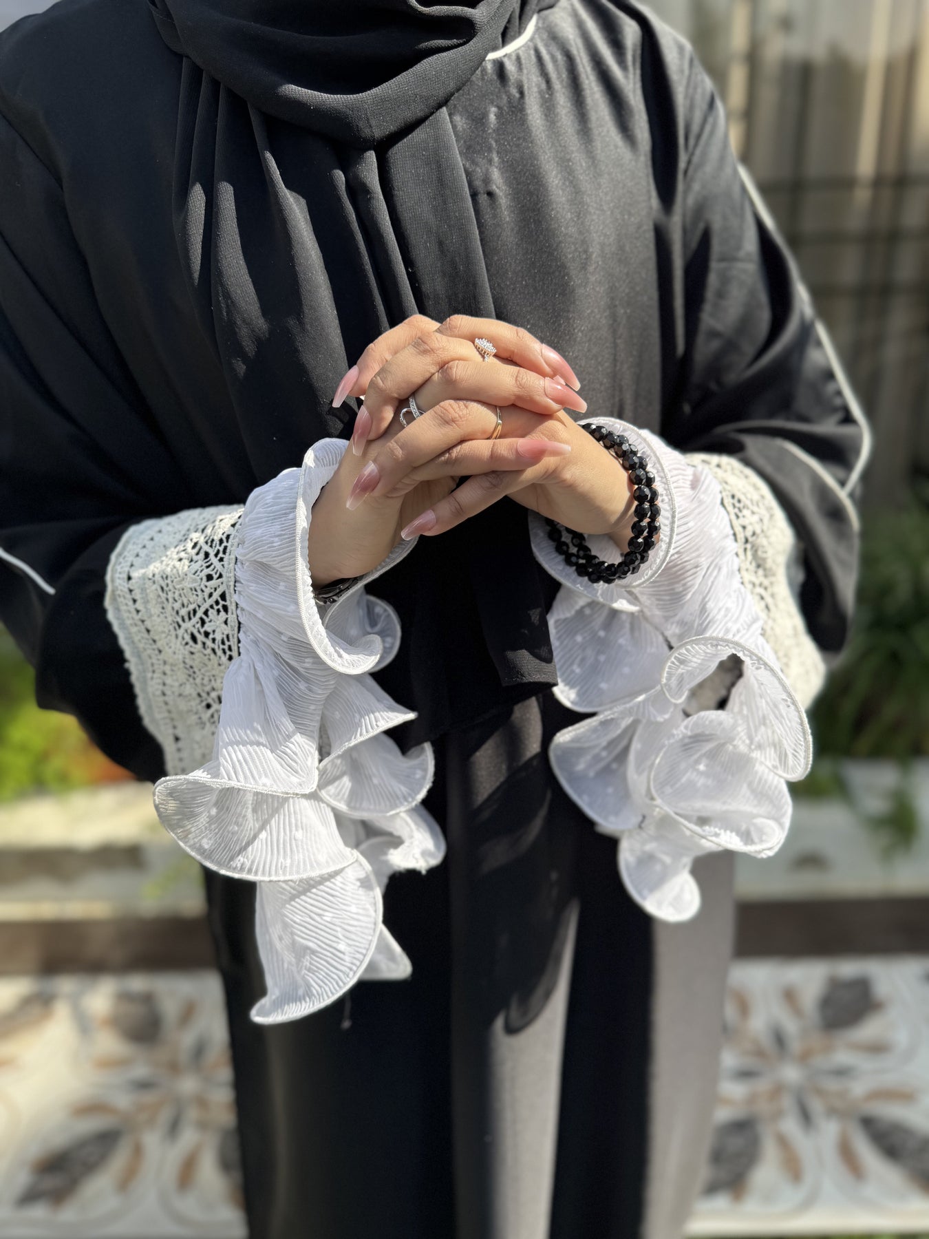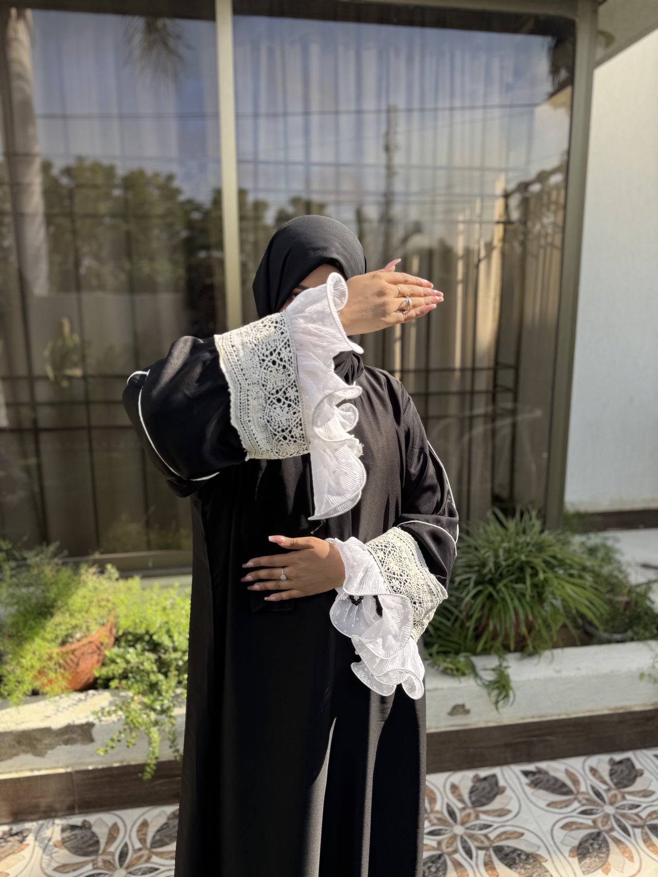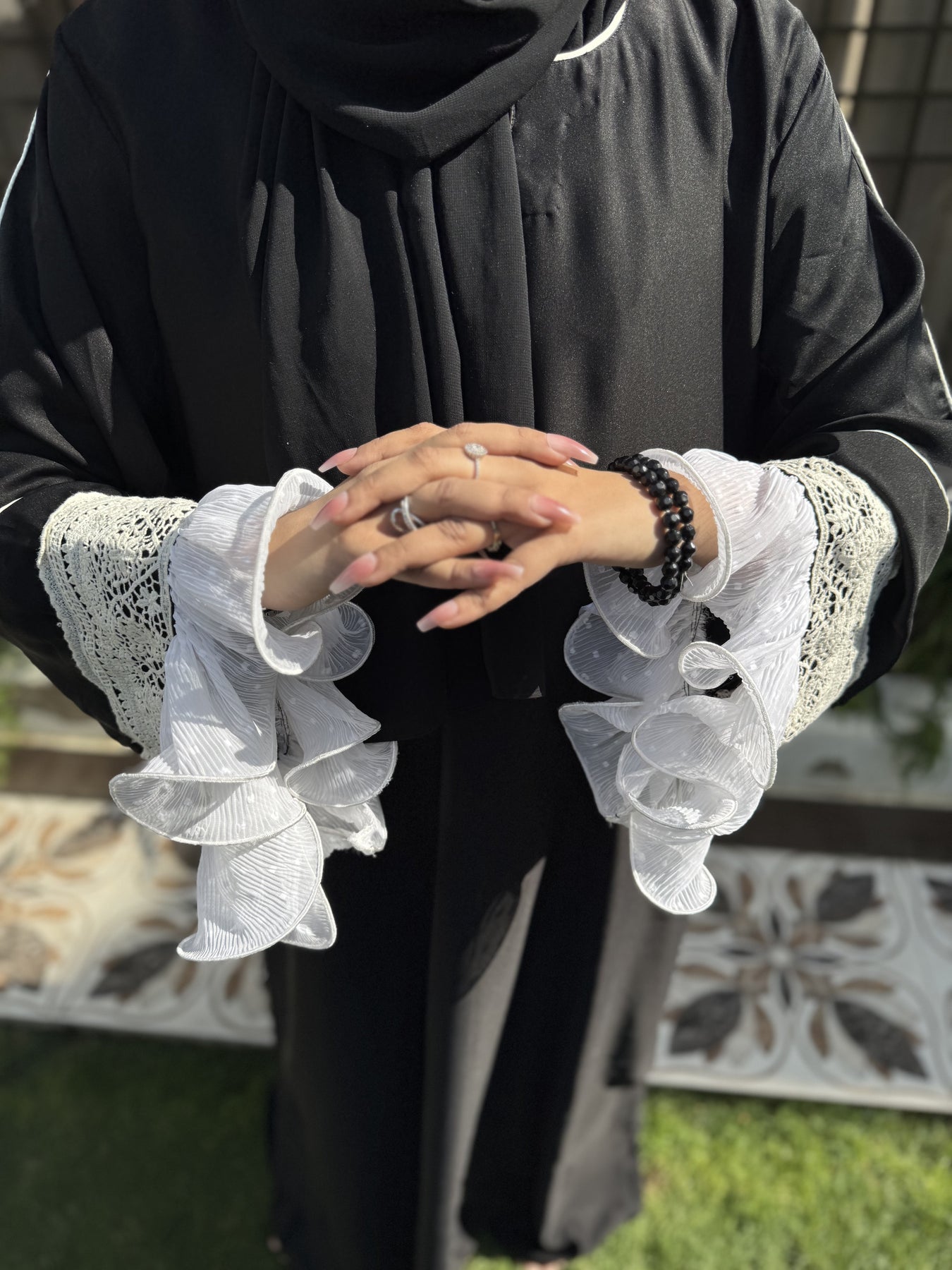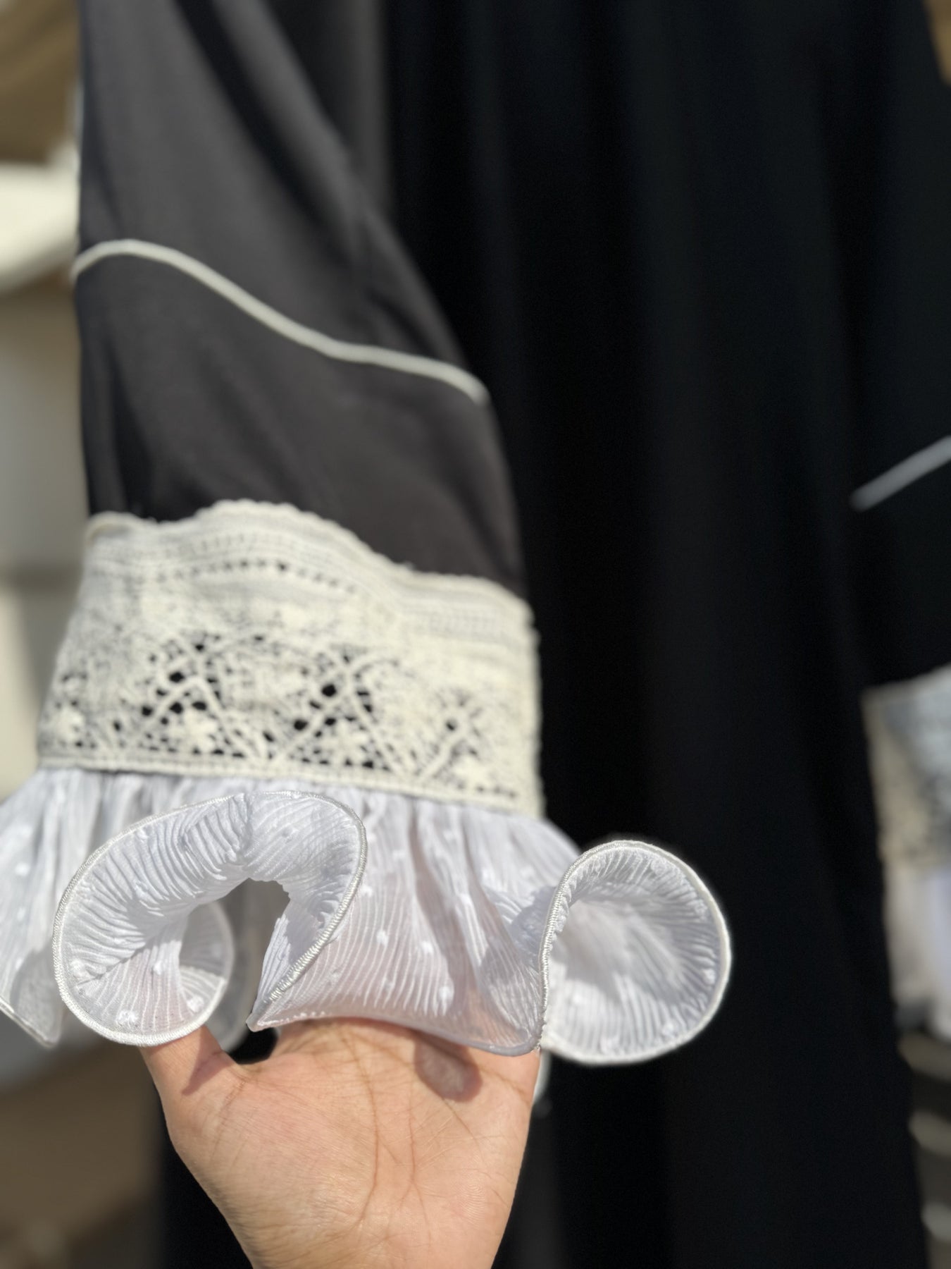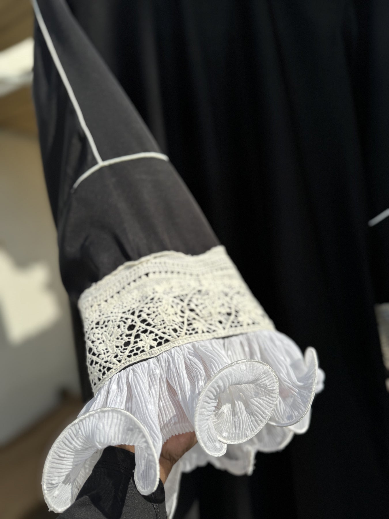 Midnight Ruffle – Crochet & Frill Sleeve Abaya Set