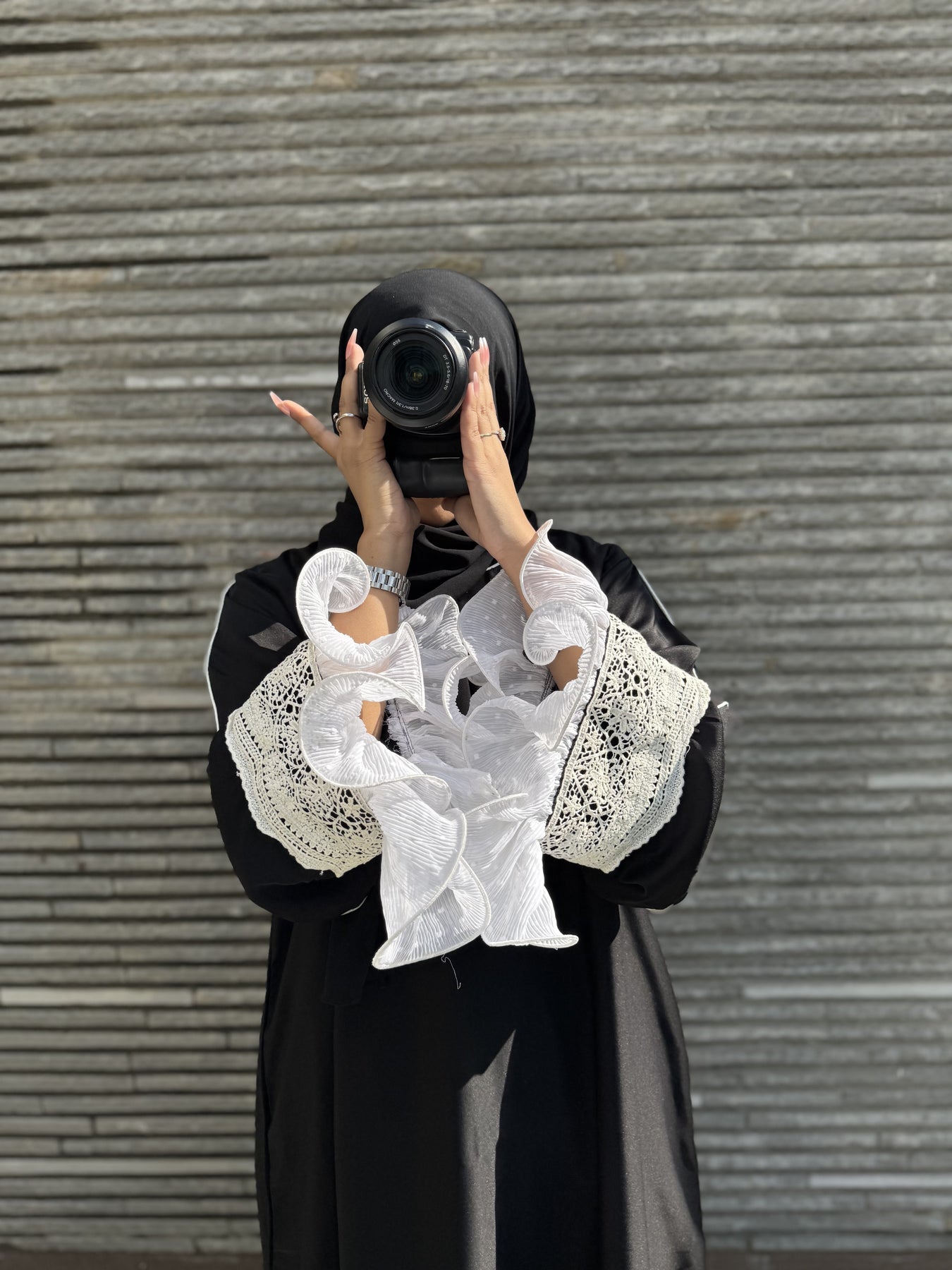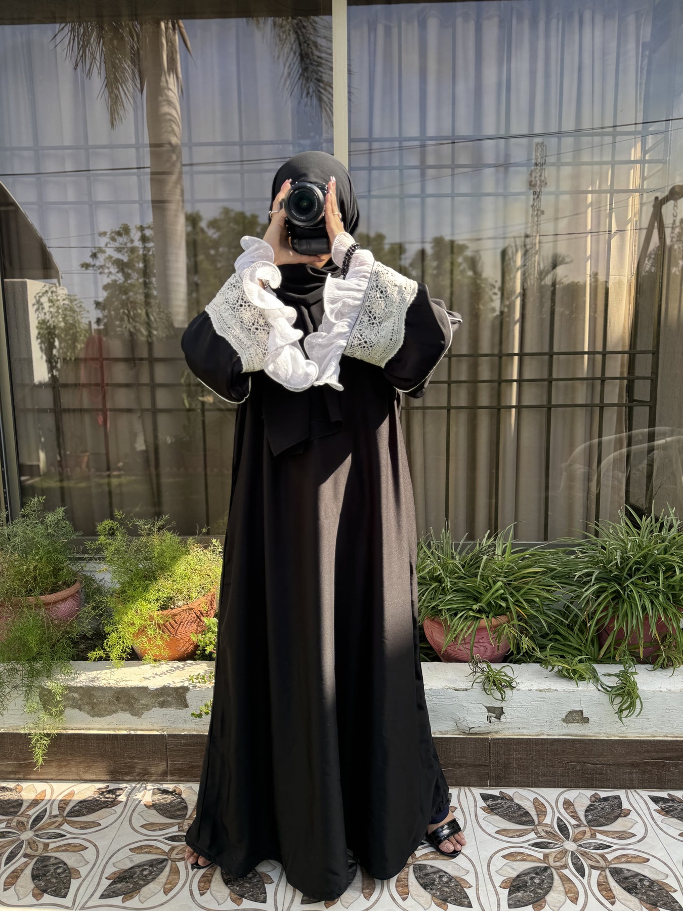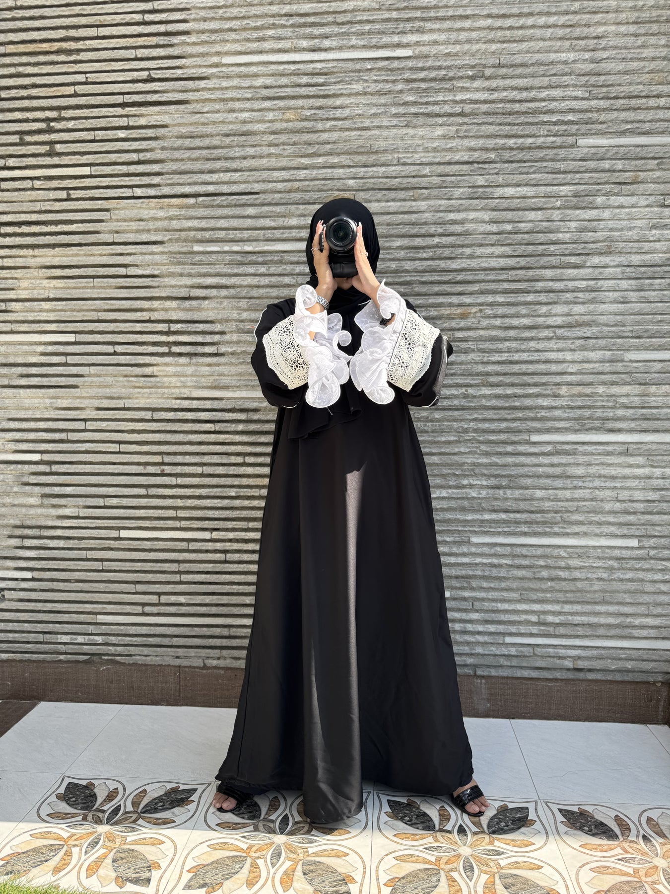 Crafted from premium Korean Nada in deep black, the Midnight Ruffle abaya is a stunning blend of bold elegance and detailed craftsmanship. The statement sleeves feature intricate white crochet panels finished with layered chiffon frills—adding movement, femininity, and a touch of flair to your modest wardrobe. This 2-piece set includes a matching black chiffon hijab for a complete, polished look.