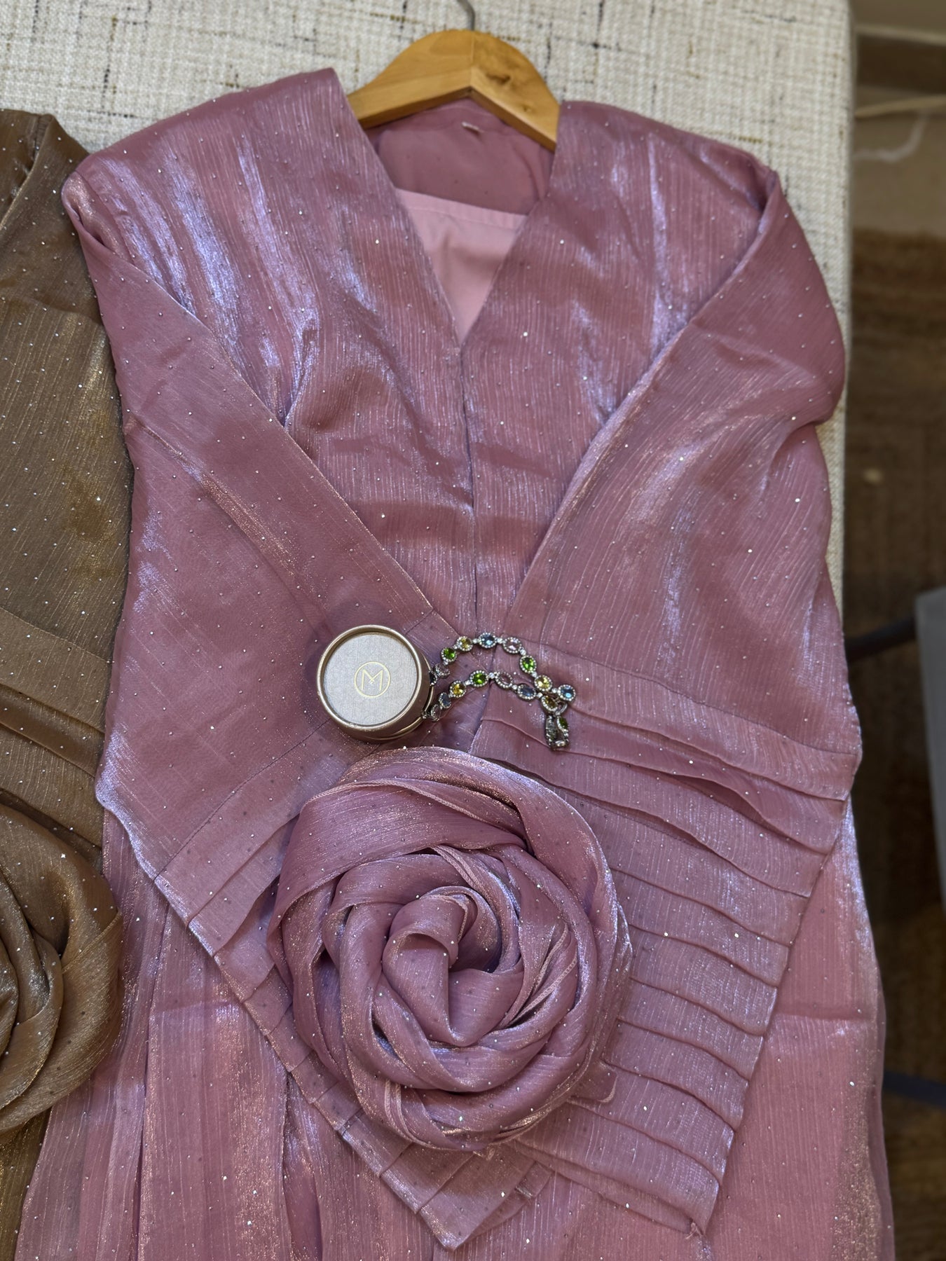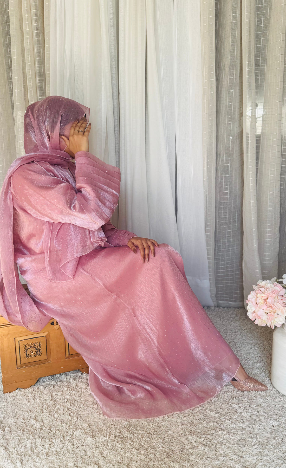 This set includes a flowing abaya with attached chiffon fabric, a matching satin hijab, and a premium Nada inner dress — designed to drape you in divine elegance from head to toe. With its luminous fabric and commanding silhouette, it is not just attire, but a statement of prestige.