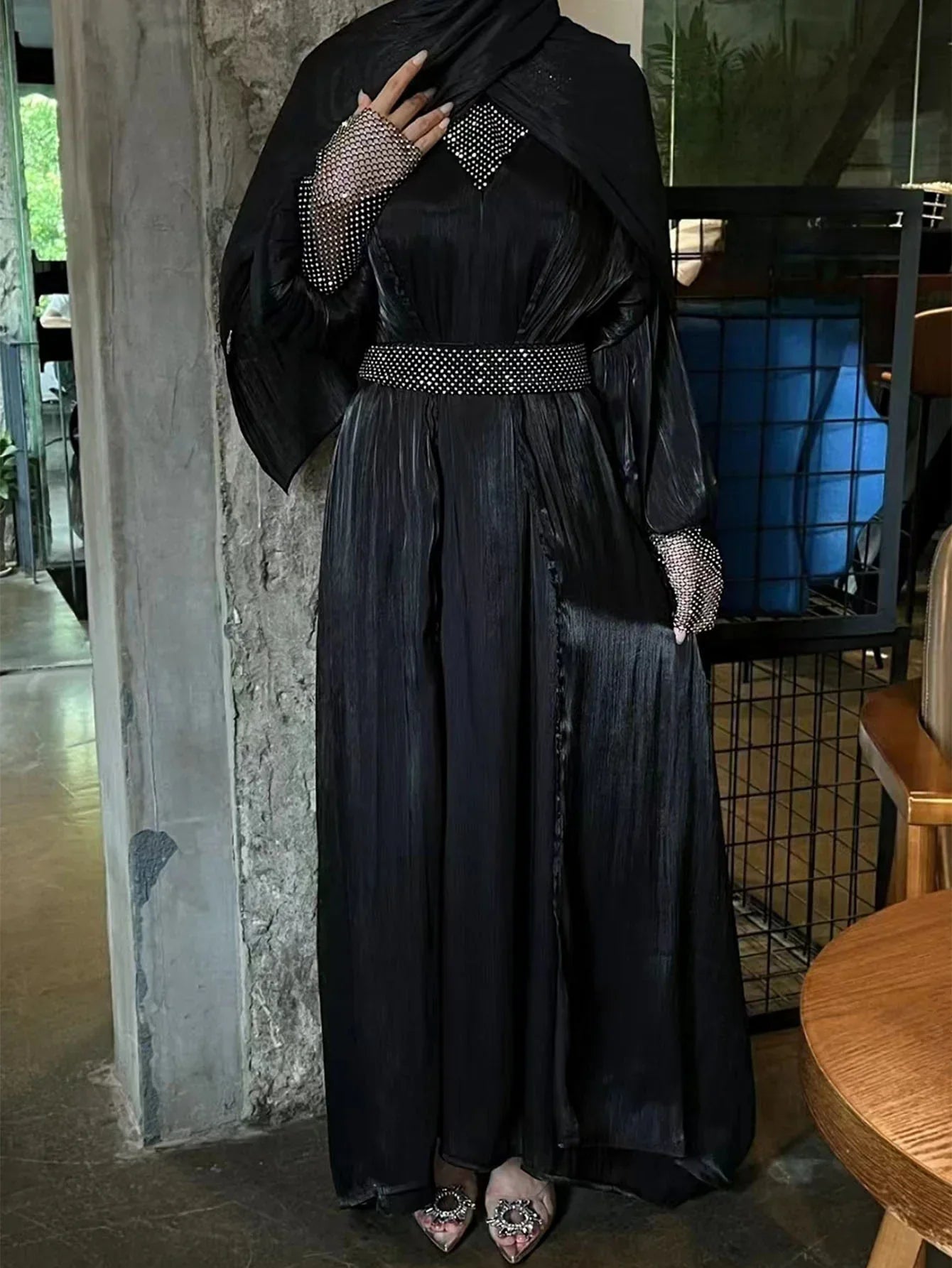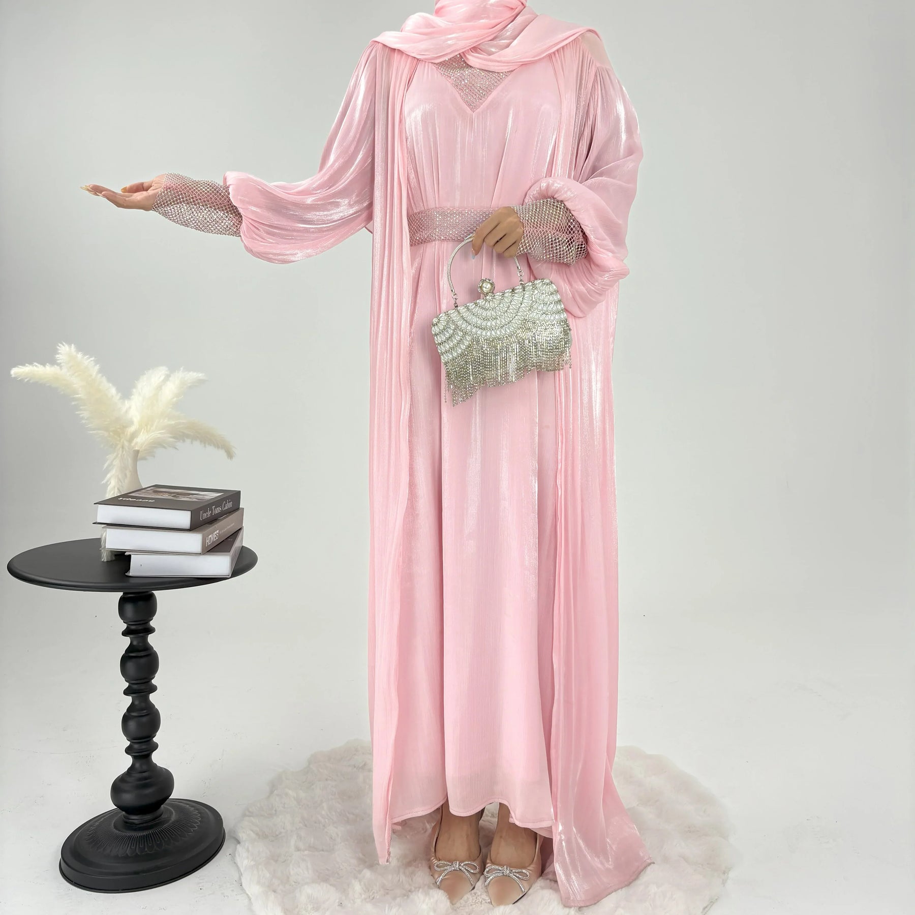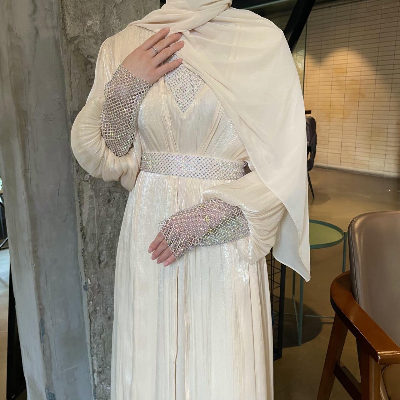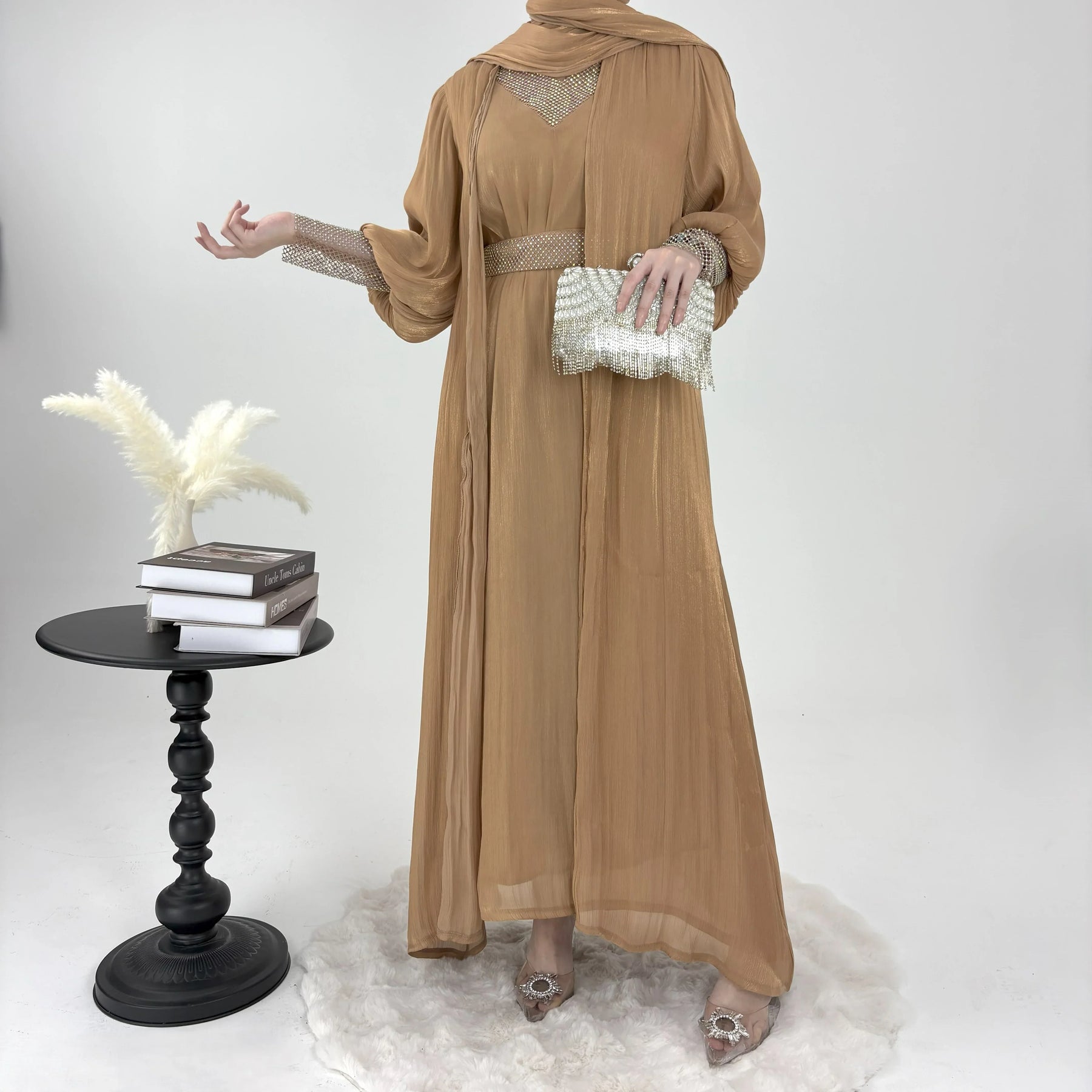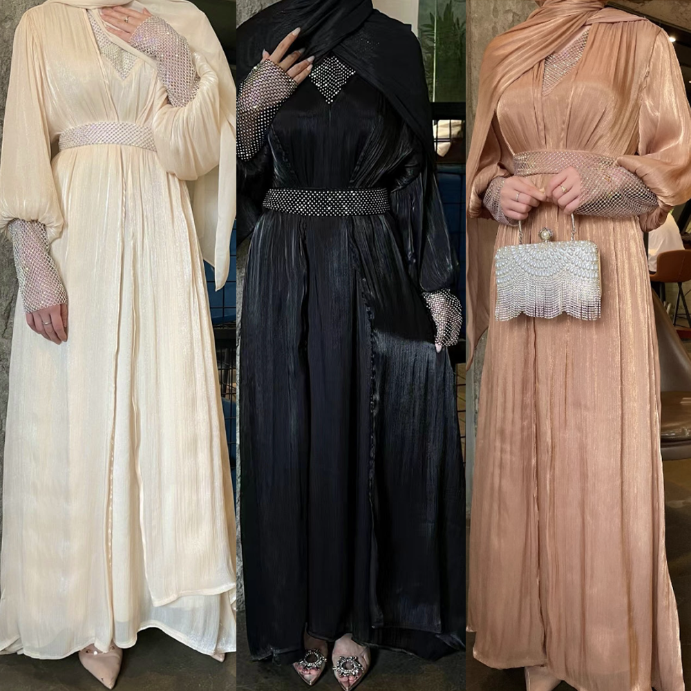 The premium festive abaya gown in satin silk is perfect for festive season. It is a 4-pc luxury abaya including a separate gown, embellished belt and matching silk hijab.![]()