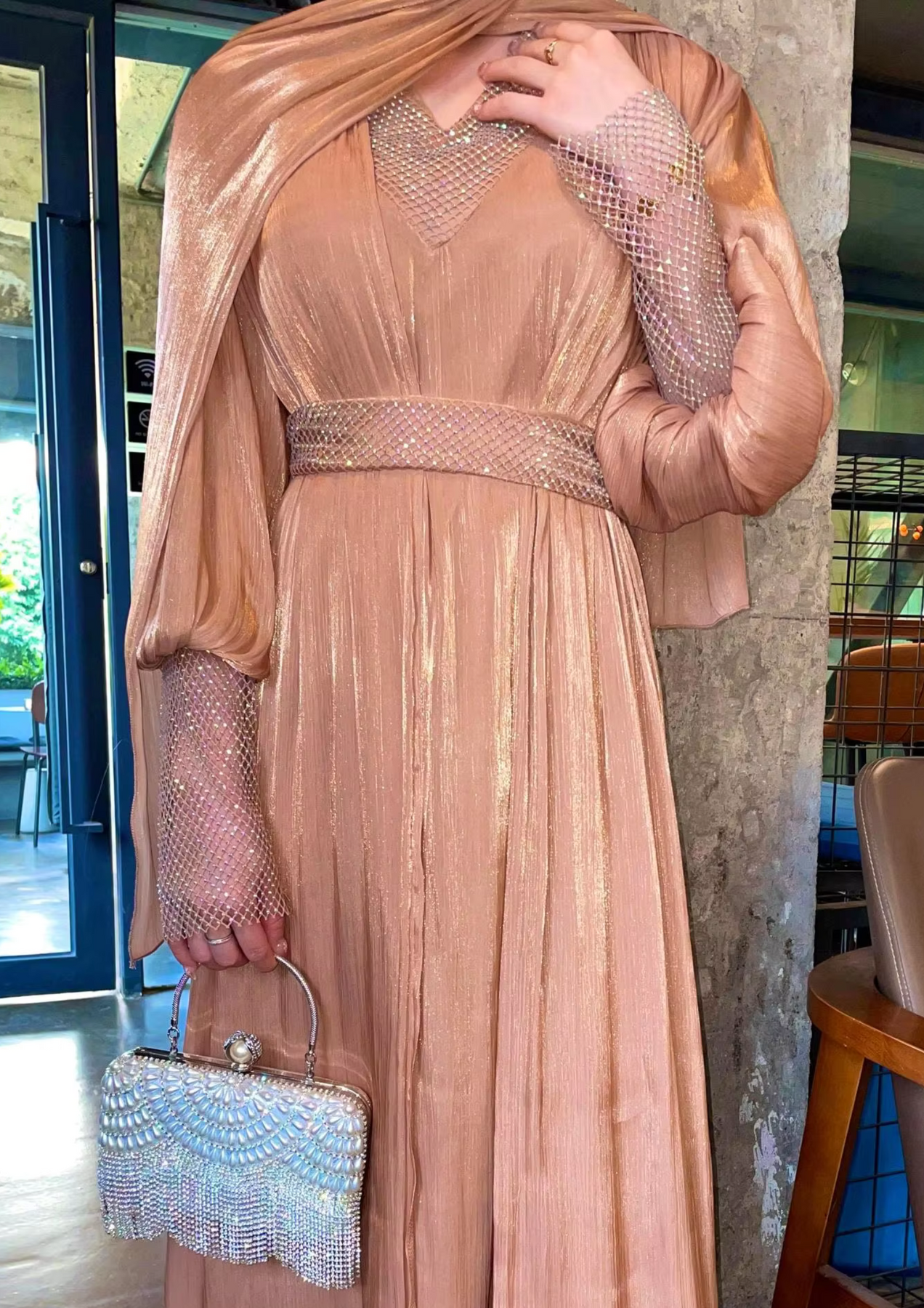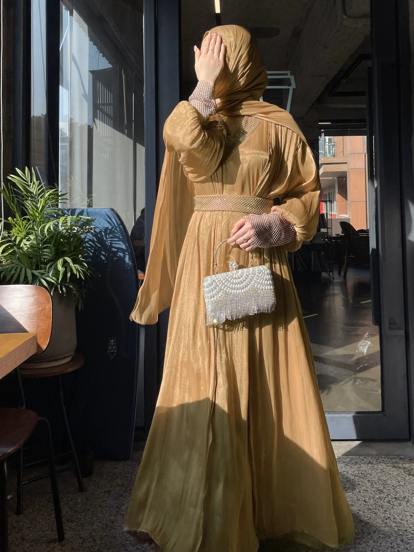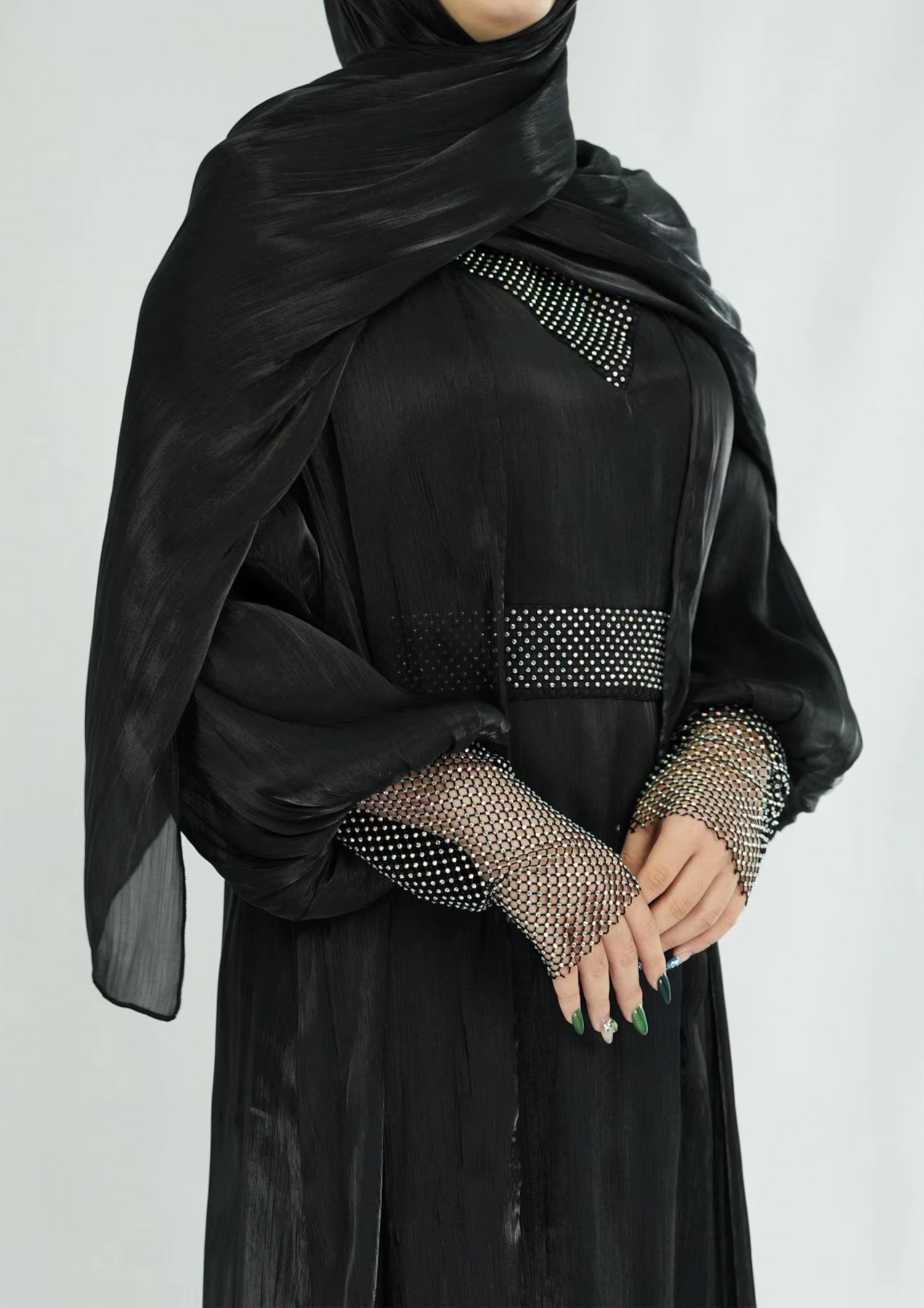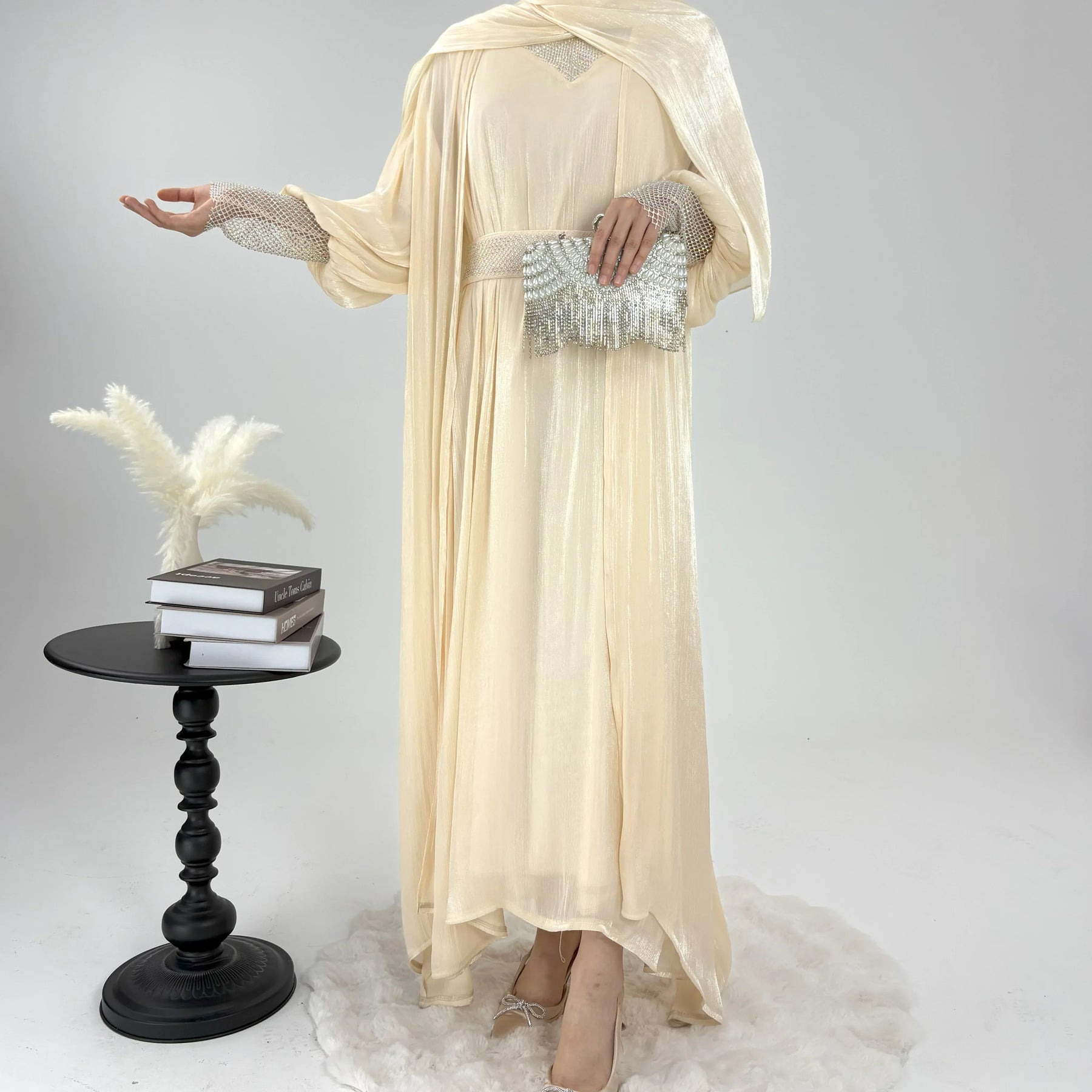 The premium festive abaya gown in satin silk is perfect for festive season. It is a 4-pc luxury abaya including a separate gown, embellished belt and matching silk hijab.![]()
