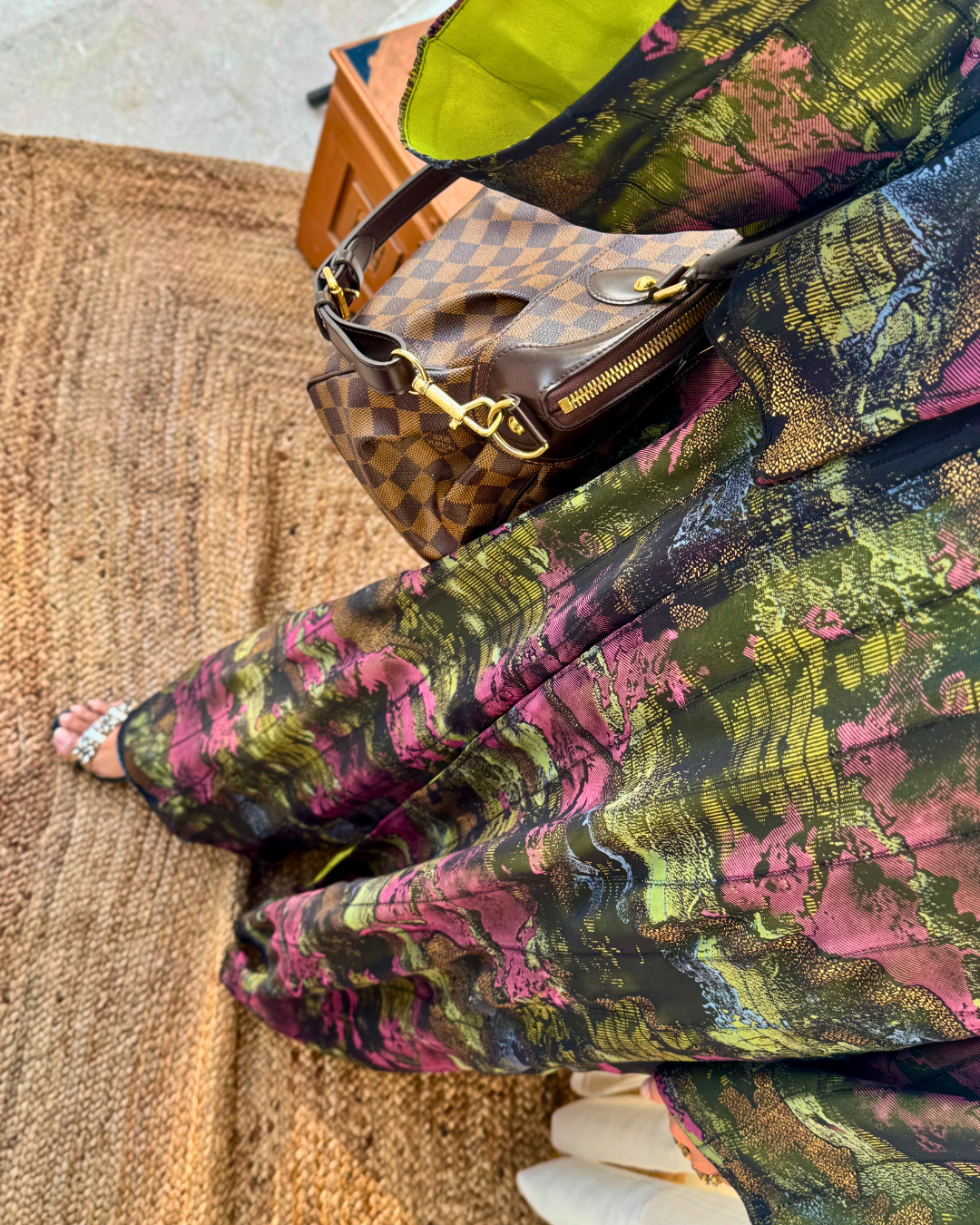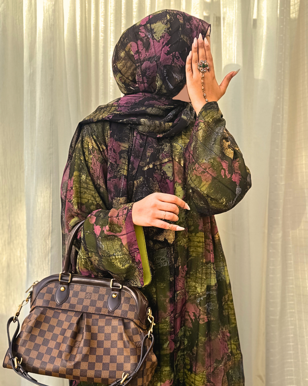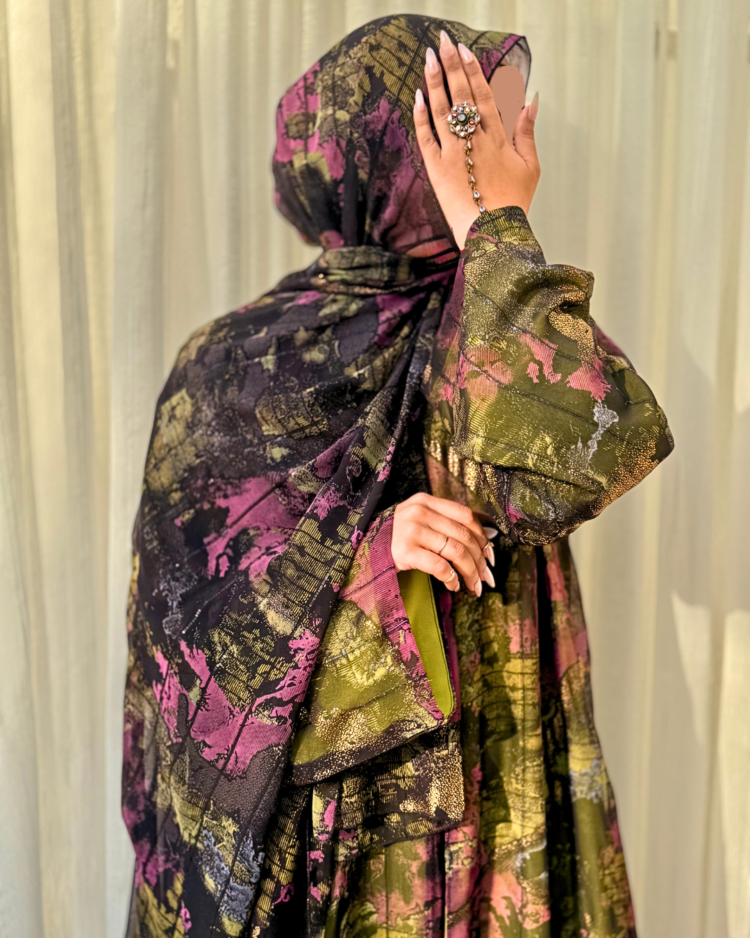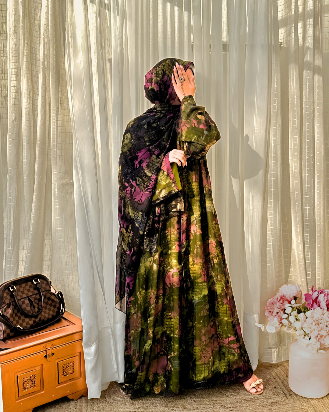 • 🖤 2-piece pure chiffon flowy black abaya with attached green chiffon fabric