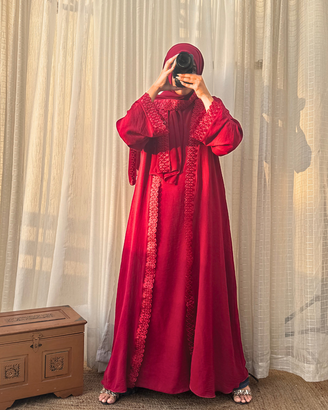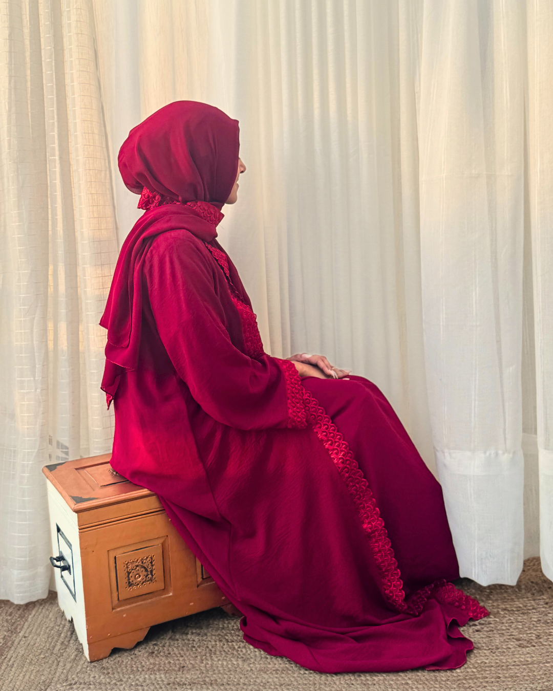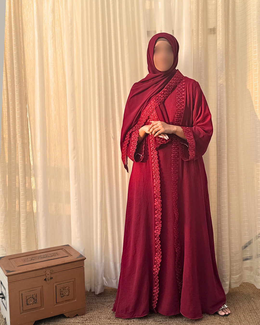 🌸 Beautifully tailored Turkish linen outer abaya featuring delicate maroon lace detailing