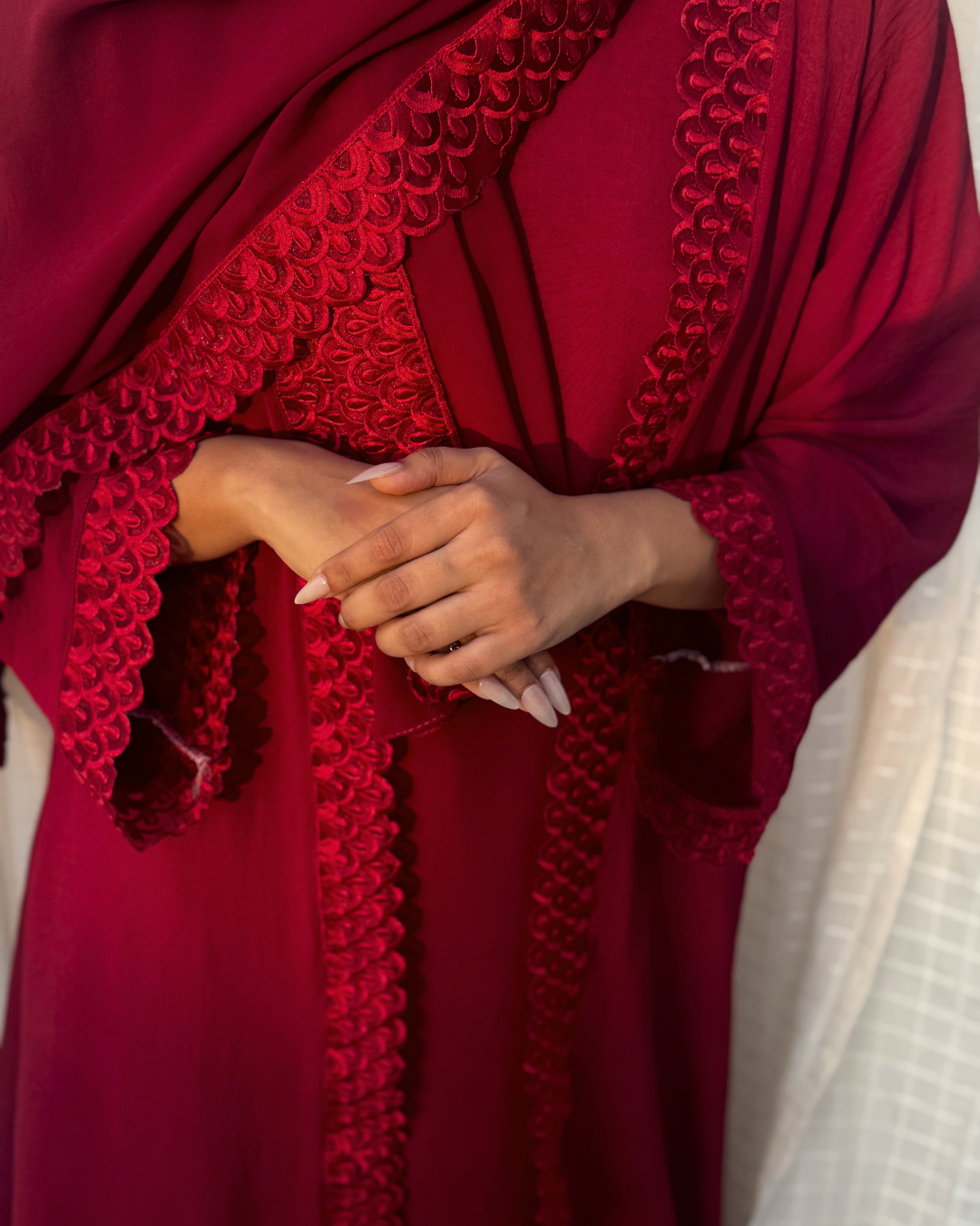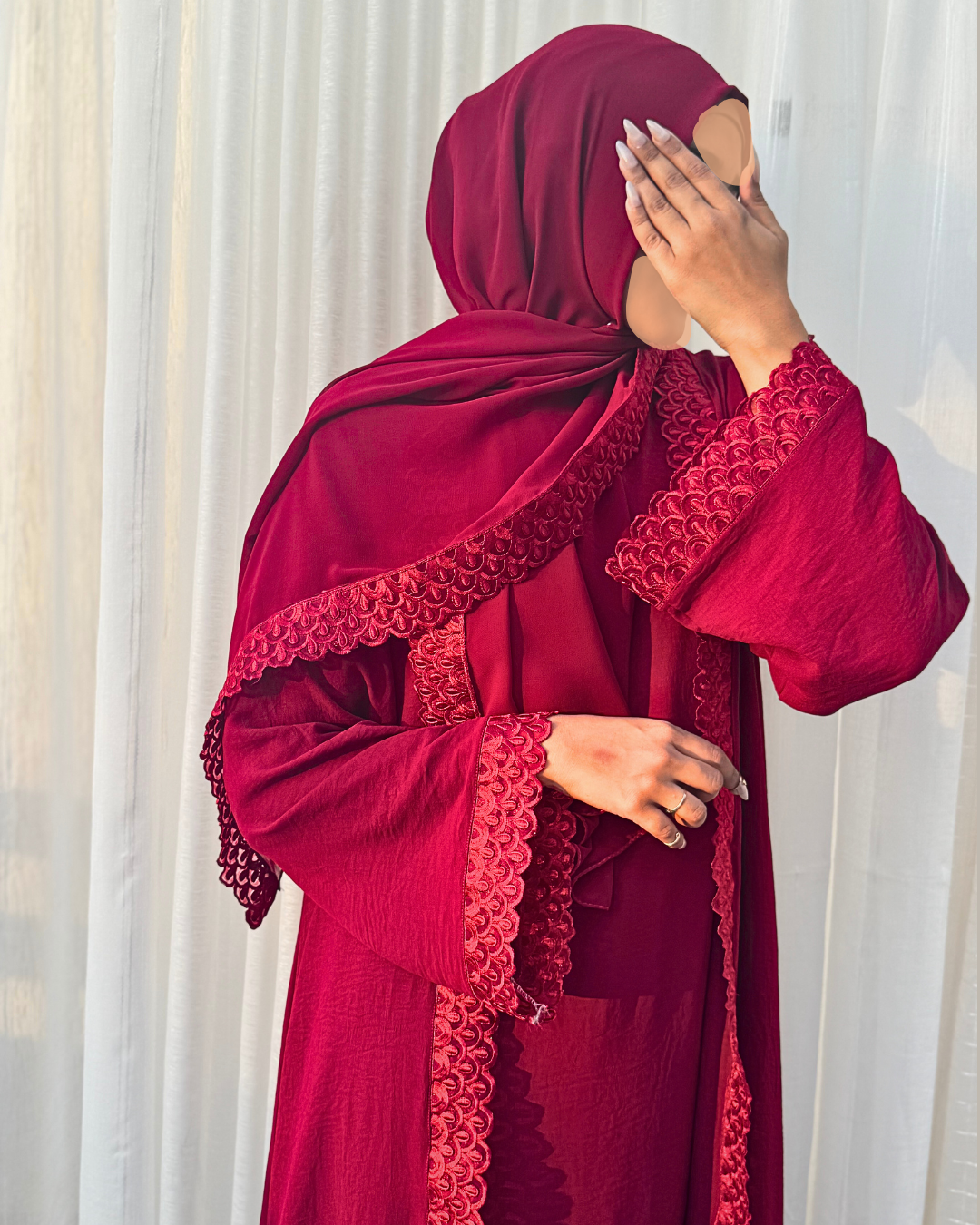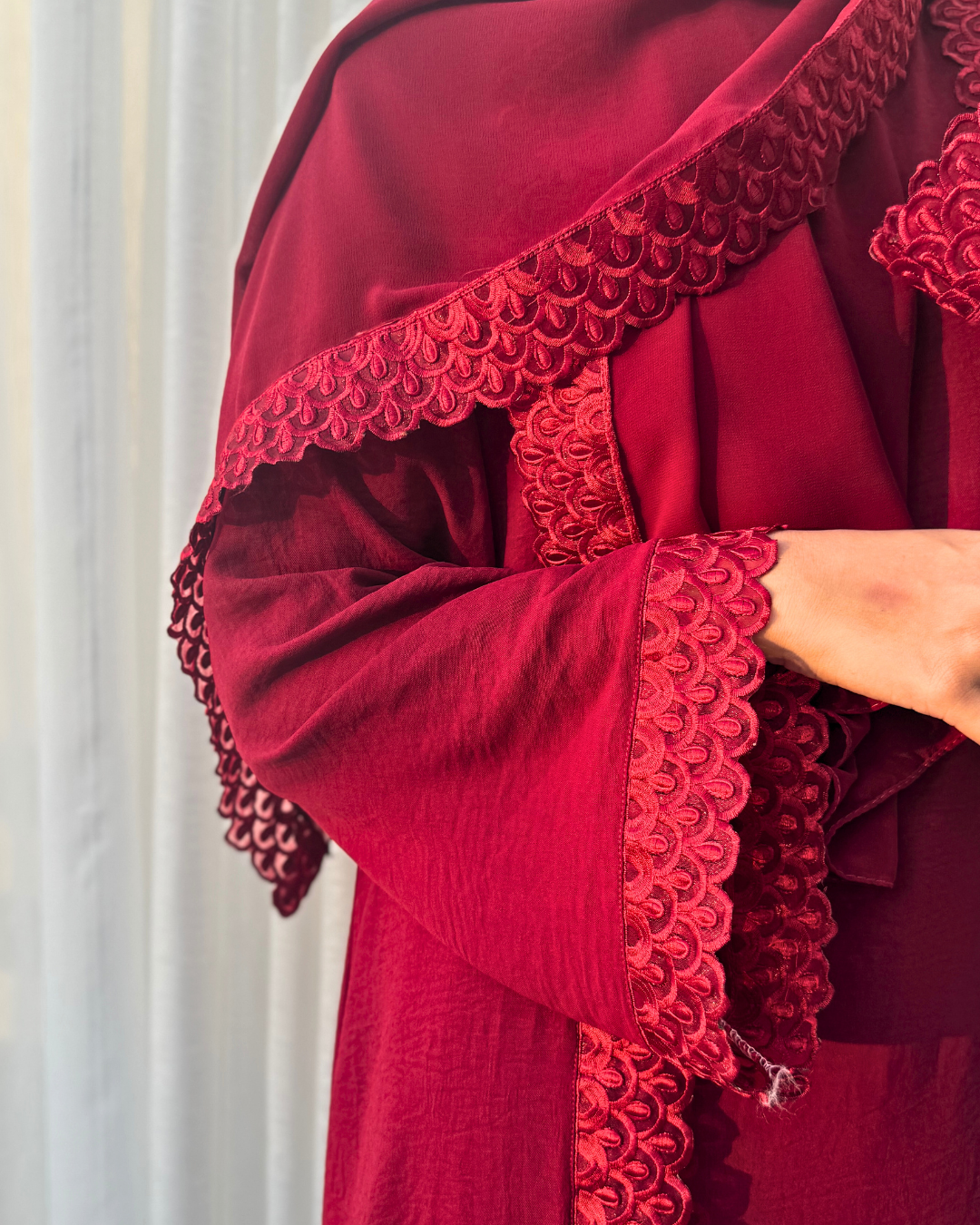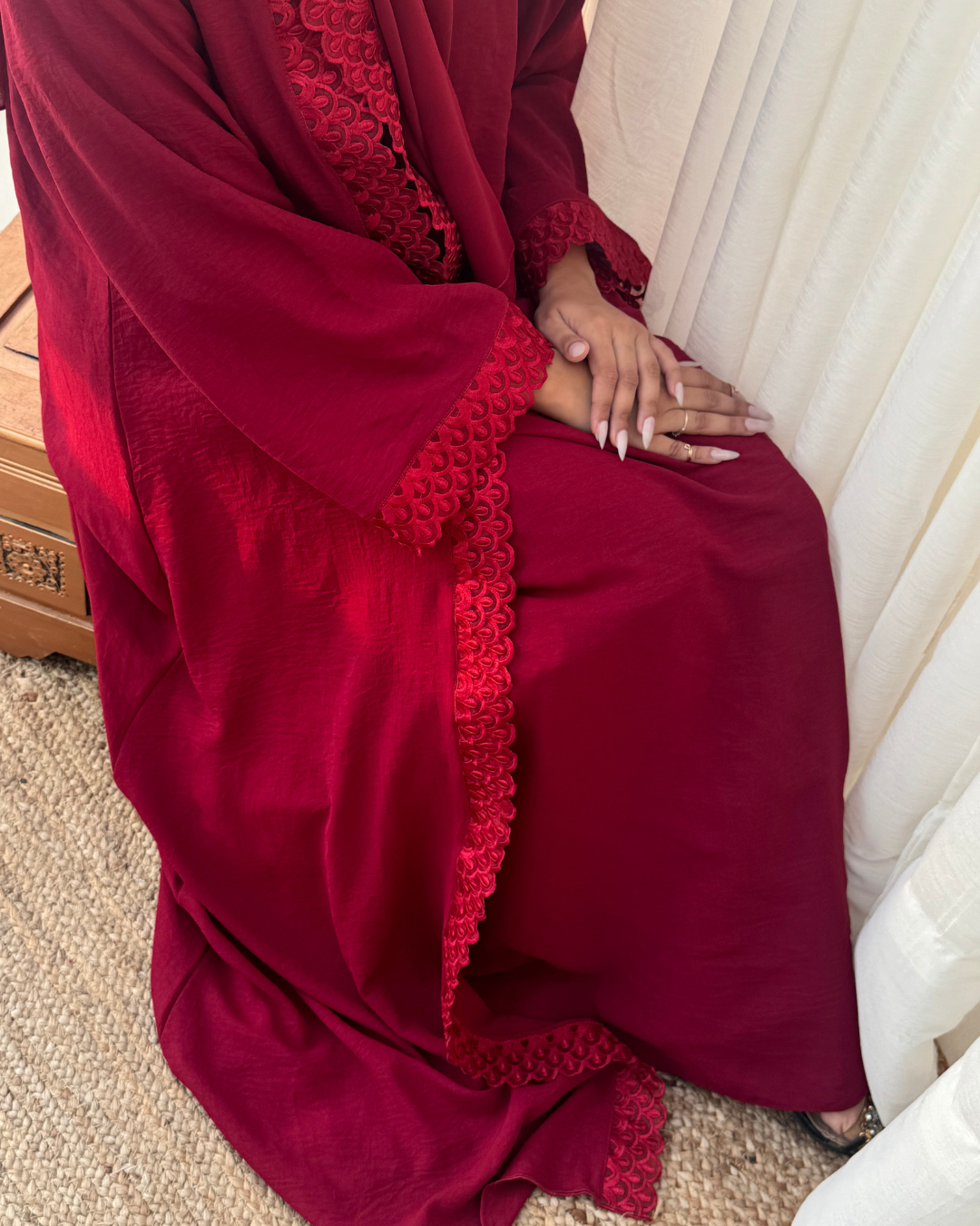 🌸 Beautifully tailored Turkish linen outer abaya featuring delicate maroon lace detailing