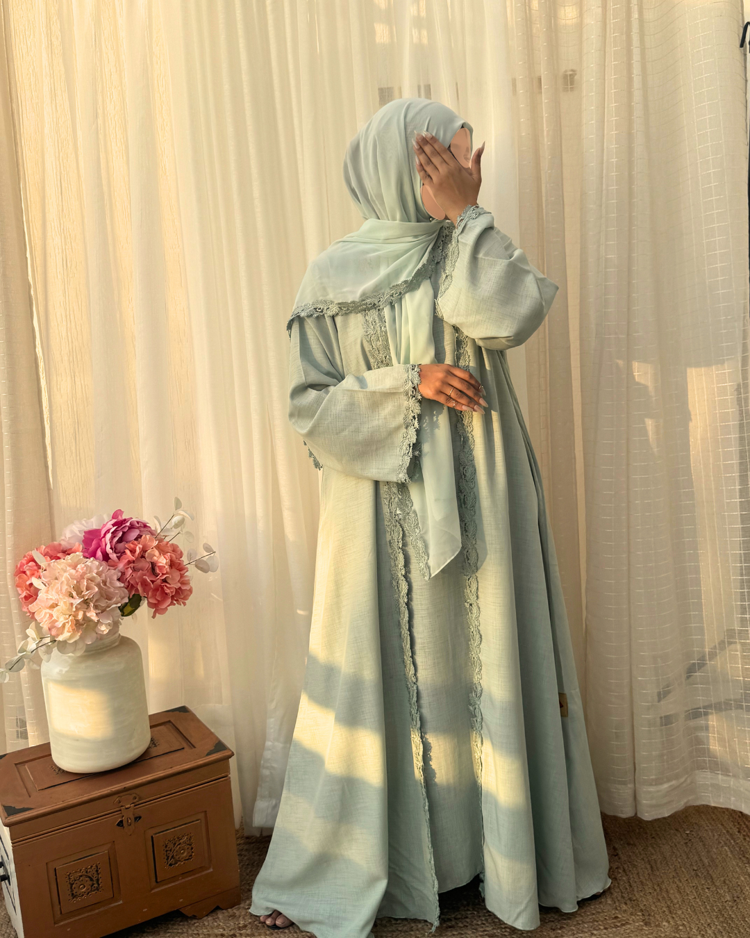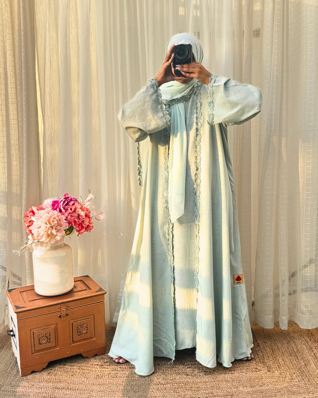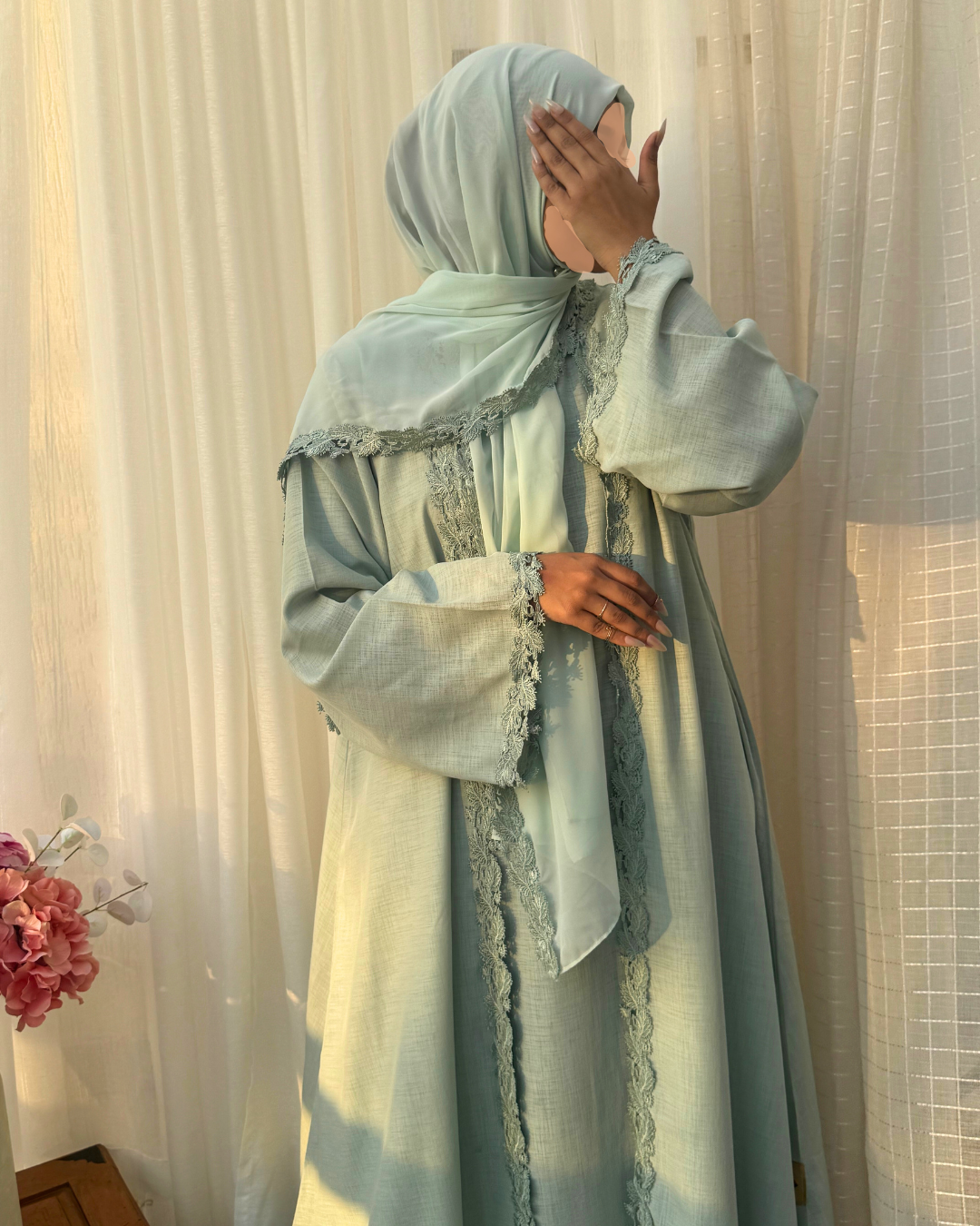 🌸  Beautifully tailored Turkish linen outer abaya featuring delicate mint lace detailing