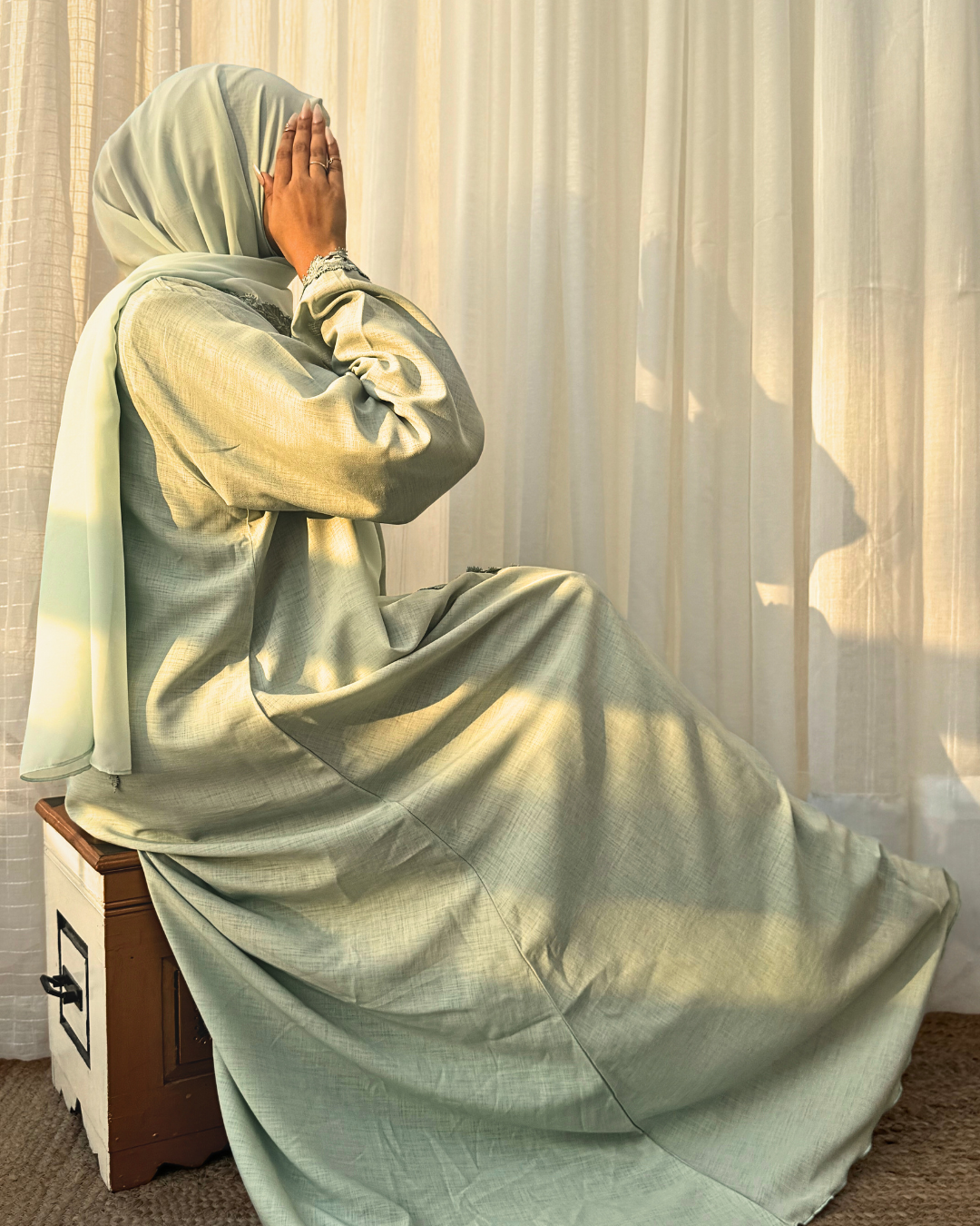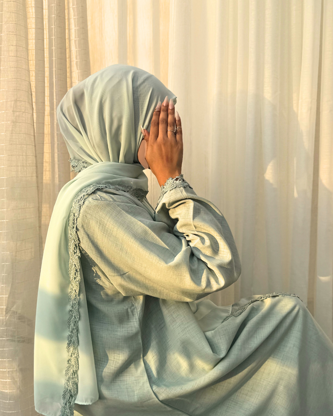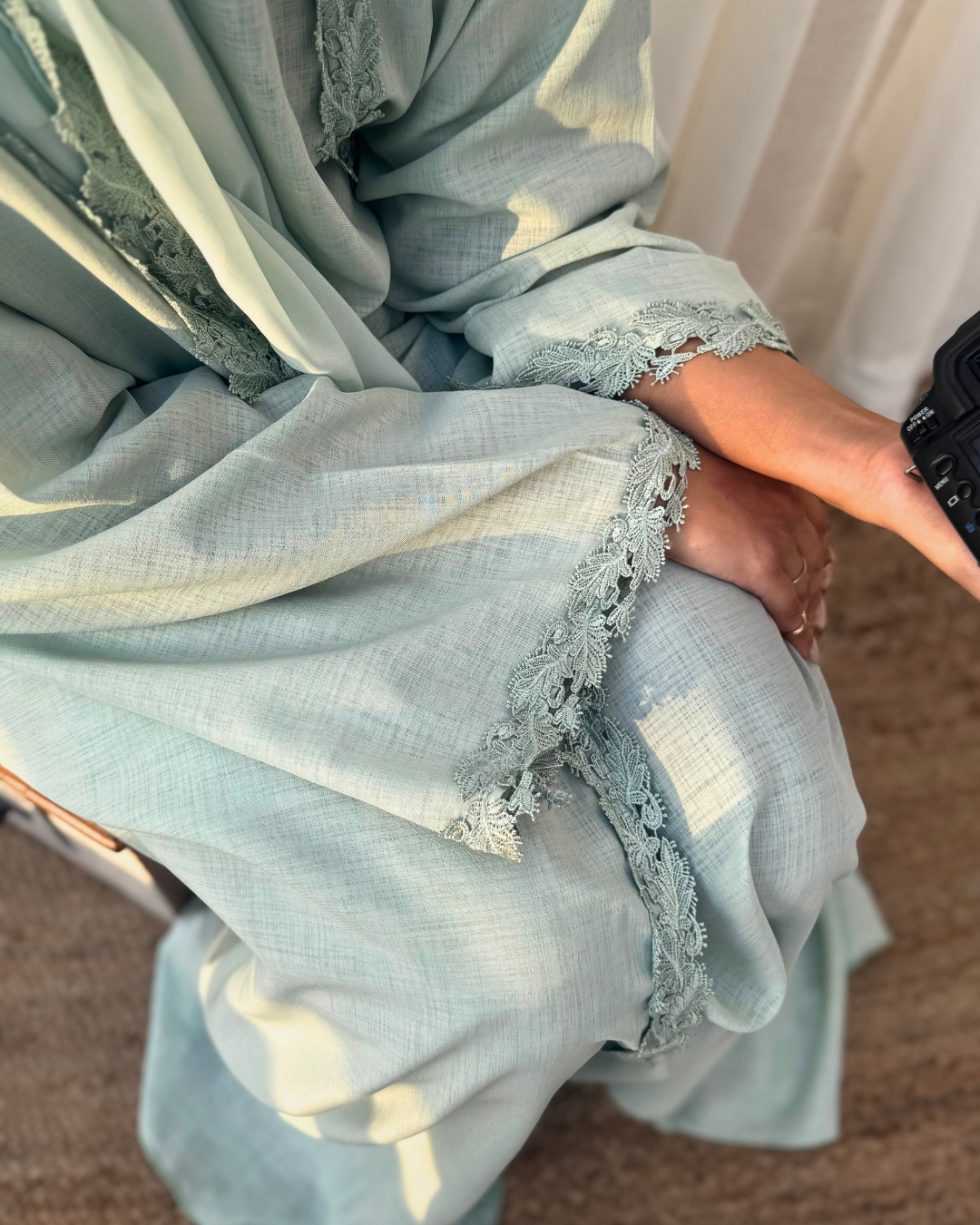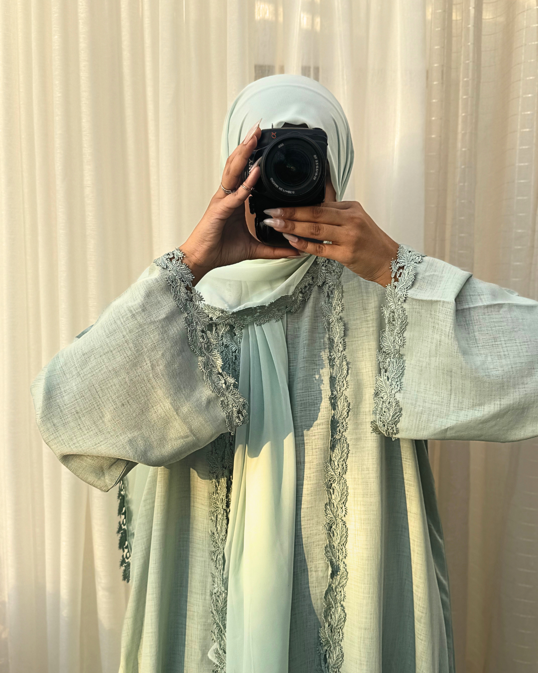 🌸  Beautifully tailored Turkish linen outer abaya featuring delicate mint lace detailing